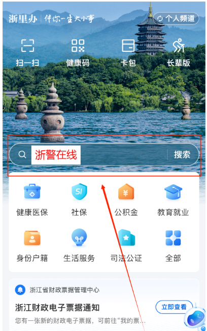 2. 在搜索框输入“浙警在线”。