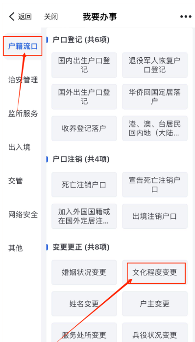 5. 点击户籍流口,选择“文化程度变更”。