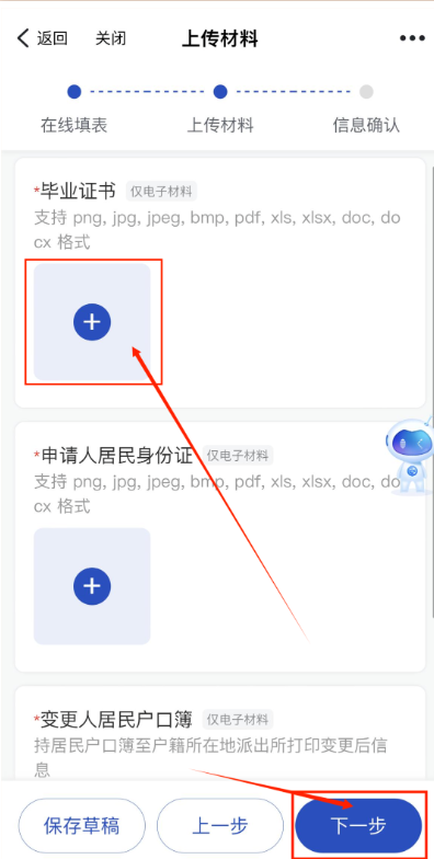 9. 上传材料,提交。(确保“上传材料”界面出现的毕业证书为最高学历证书,如果毕业证书不是您最高学历,你可以点击“+”图标,上传手机中事先准备好的毕业证书照片;确保申请人居民身份证、变更人居民户口簿信息无误。)