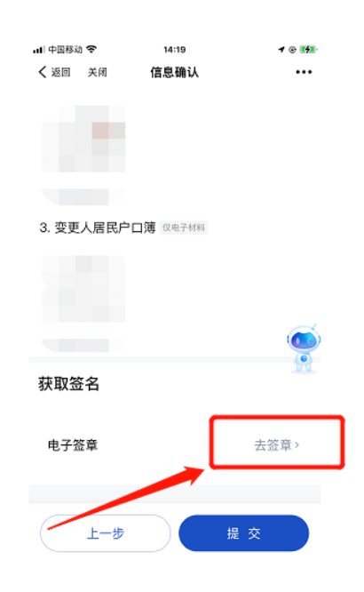 10. 进入“信息确认”界面,下拉至底部,在“获取签名”处,点击“去签章”