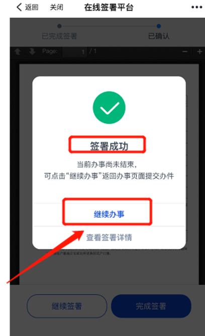12.签署成功,点击继续办事。