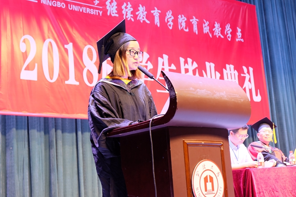 宁波大学继续教育学院副院长陈伯利在典礼上致辞。他指出:2017年9月宁波大学被国家教育部、财政部命名为“双一流”大学,即为:“世界一流大学和一流学科的大学。”建设世界一流大学和一流学科是中国共产党中央、国务院作出重大的战略决策,有利于提升中国高等教育综合实力和国际竞争力,为实现“两个一百年”奋斗目标和中华民族伟大复兴的中国梦提供有力的支撑。陈院长向毕业生阐述了“双一流”建设重要任务和建设总目标;希望毕业生们不忘初心,继续努力!最后祝愿宁波大学各位毕业生在今后各自岗位上,为国家、为社会重创辉煌,再展宏图。
