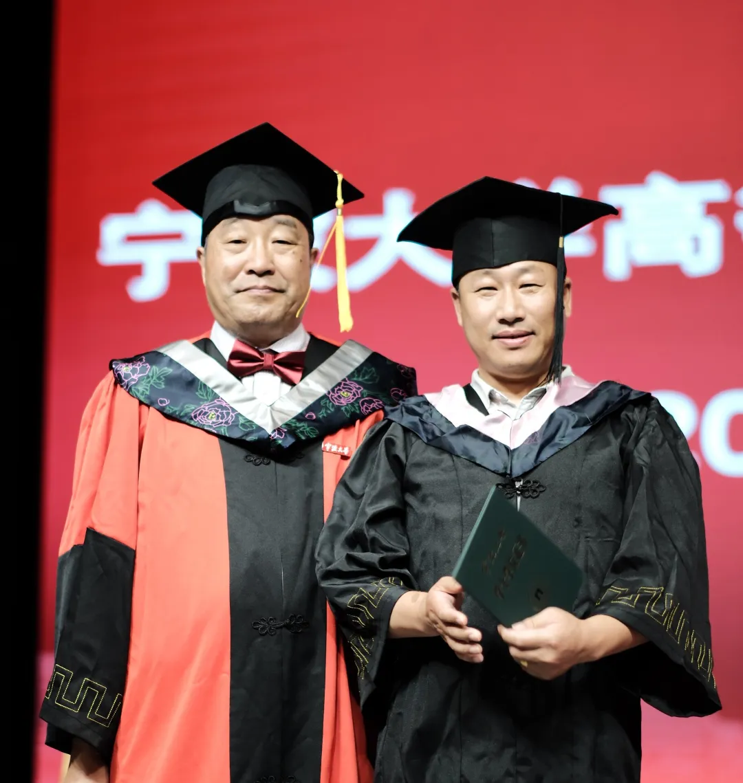 宁波大学继续教育学院院长蔡真亮、育成教育校长陈伯利为获得学士学位的毕业生拨穗并合影留念。