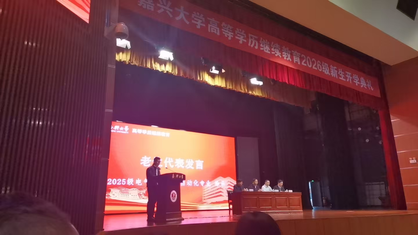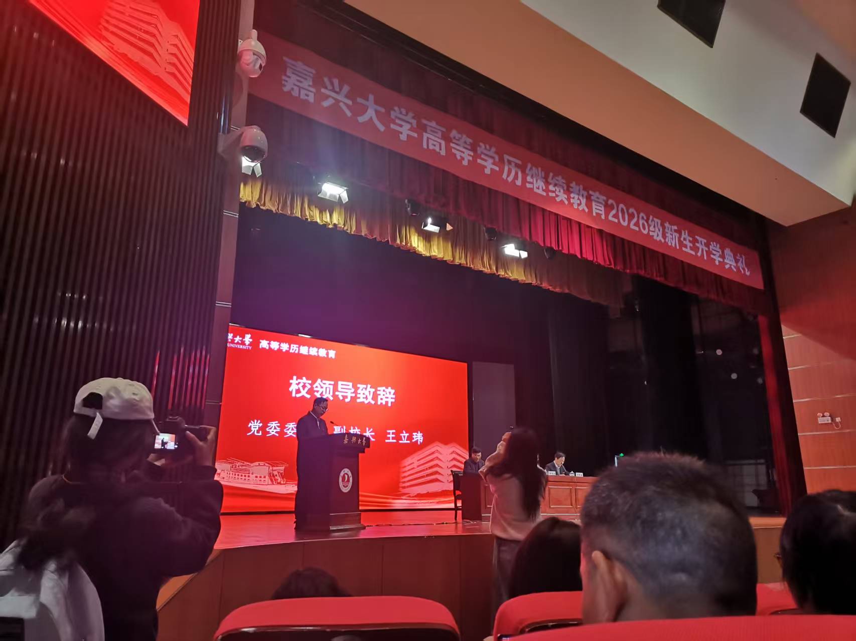 嘉兴大学党委委员、副校长王立玮发表了热情洋溢的致辞。他首先对 2026 级新生的到来表示热烈欢迎,并回顾了学校高等学历继续教育学院的发展历程与办学成果。王立玮副校长强调,继续教育同样是人生成长的重要阶段,希望全体新生珍惜时光、勤奋学习、勇于创新,努力成长为德才兼备的栋梁之才。