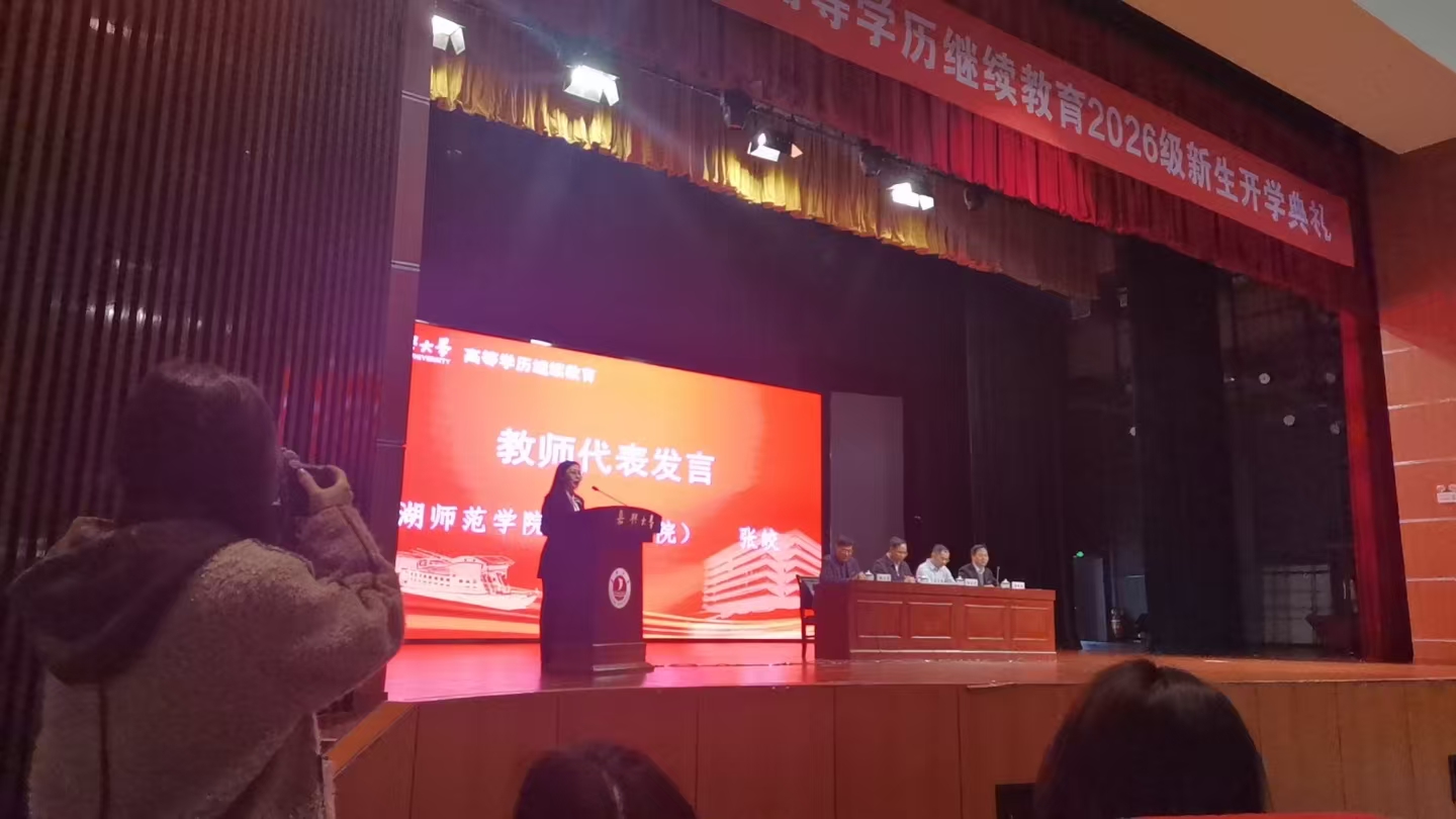 教师代表平湖师范学院张皎老师上台发言,向全体新生致以最热烈的欢迎。她表示,大家选择继续教育,彰显了奋进向上的勇气与追求,学习路上的每一份努力都将成就更好的自己。全体教师将全力做好引路人,祝愿同学们在嘉兴大学学有所成、勇敢追梦,书写属于自己的精彩人生!
